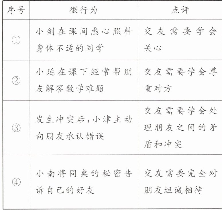 (3)答:①“我”责怪小溪并疏远她,这是极其不理智的行为。这说明当我们与朋友发生矛盾的时候要保持冷静,稳住自己的情绪。②小溪用写信的方式告诉“我”她的感受,这说明当我们与朋友发生矛盾冲突时,要主动与朋友坦诚交流,以免误会加深。③“我”看到信后主动向小溪道歉,这说明当我们与朋友发生矛盾冲突时,要勇于承担责任,真诚地向朋友道歉。④小溪没有在同学面前指责“我”,并在信的末尾还表示会忘记不开心的事情,这说明我们在处理与朋友之间的矛盾时要学会换位思考。⑤“我”和小溪的故事告诉我们与朋友发生矛盾时,要沟通协商,寻找彼此可以接受的解决方式。