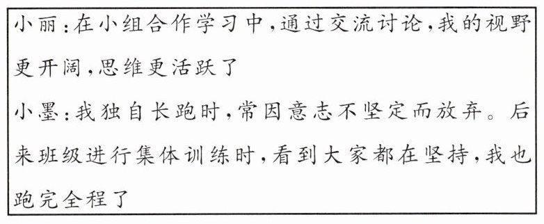 材料二 小浩说:“在小组合作学习中,我的视野更开阔、思维更活跃了。”小梦说:“从农村来到镇上读初中,寄宿生活大大提高了我的生活自理能力。”