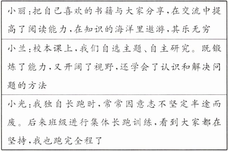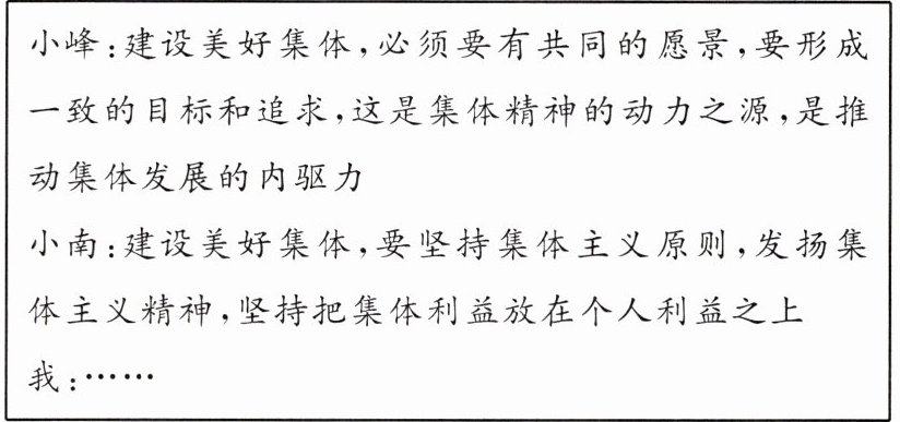 (1)答:①建设美好集体,要树立主人翁意识,我们应主动作为,各负其责,各尽其能。②建设美好集体,要营造和谐有序的集体环境,如自觉遵守规则,多些宽容和理解,抵制欺凌行为等。③建设美好集体,要树立正确的合作和竞争观念,实现共赢等。⑤建设美好集体,要坚持集体主义原则,发扬集体主义精神。