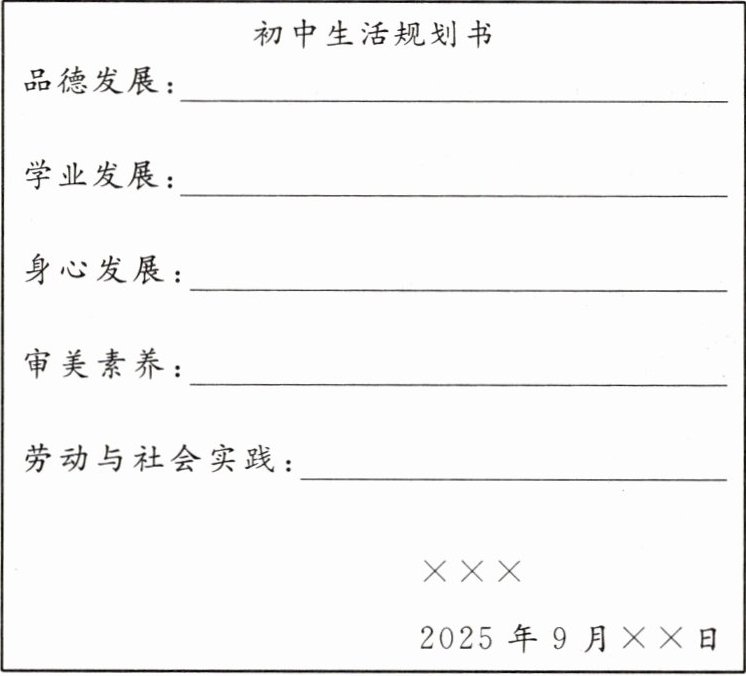 从品德发展、学业发展、身心发展、审美素养、劳动与社会实践等方面描绘自己初中阶段的成长愿景,设计并完成初中生活规划书。