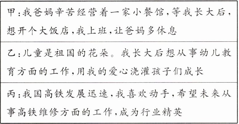 )①梦想和现实间的距离不可逾越 ②梦想是对未来美好生活的愿望 ③梦想应该与国家的发展需要联系在一起 ④从事的工作就应该是自己最感兴趣的领域
