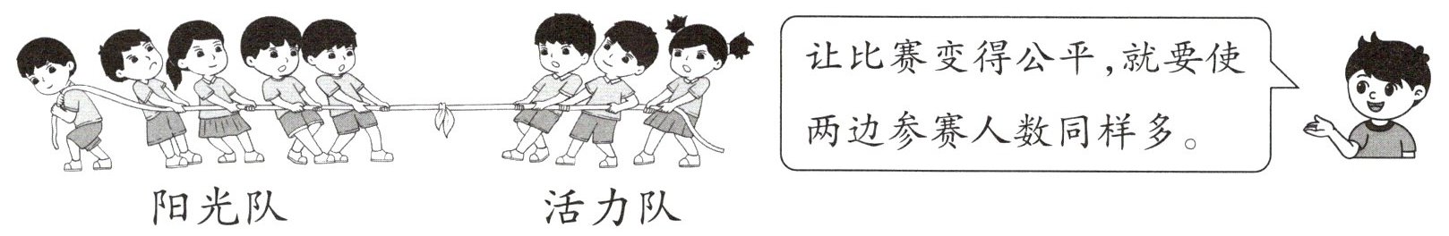 2. 一年级部分同学举行拔河比赛。如图,怎样才能让比赛变得更公平呢?