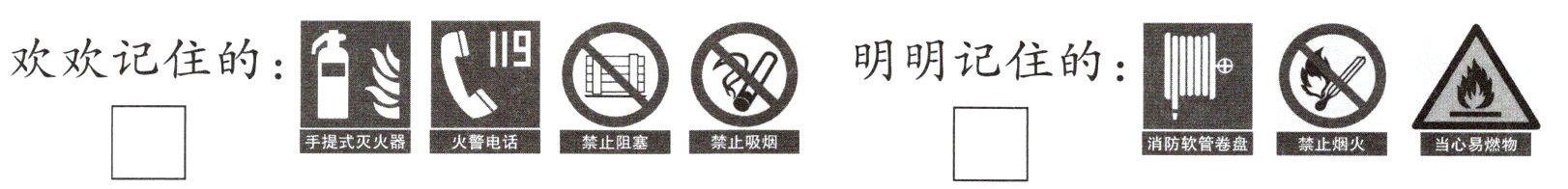 1. 每年的11月9日是全国消防日。同学们在学校组织的“消防在身边”宣传活动中,认识了很多消防安全标志。比一比,记住多的画“√”。