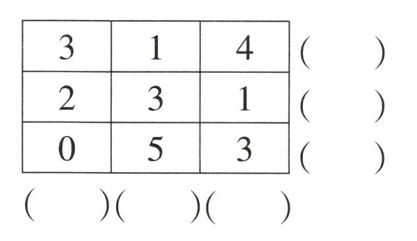 横行:$3 + 1 + 4 = 8$,$2 + 3 + 1 = 6$,$0 + 5 + 3 = 8$;竖行:$3 + 2 + 0 = 5$,$1 + 3 + 5 = 9$,$4 + 1 + 3 = 8$