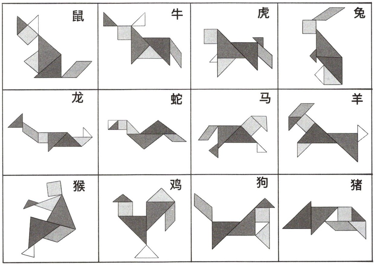 2. 选择一个属相并说清楚用了哪些形状的拼板得一颗☆,说清各用了多少块拼板得一颗☆,声音洪亮得一颗☆。