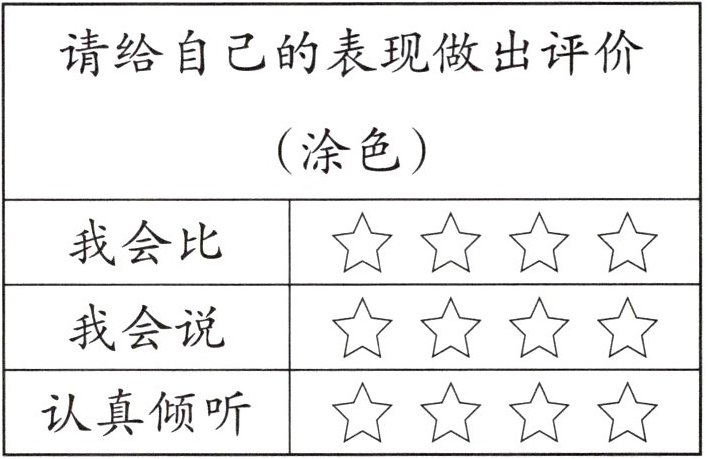 这个活动是一个自我评价的过程,目的是让学生反思自己在比较物体或数量、解释比较方法以及倾听他人发言方面的表现。学生需要根据自己的实际表现,在相应的星星处涂色,以评价自己在“我会比”、“我会说”和“认真倾听”三个方面的表现。