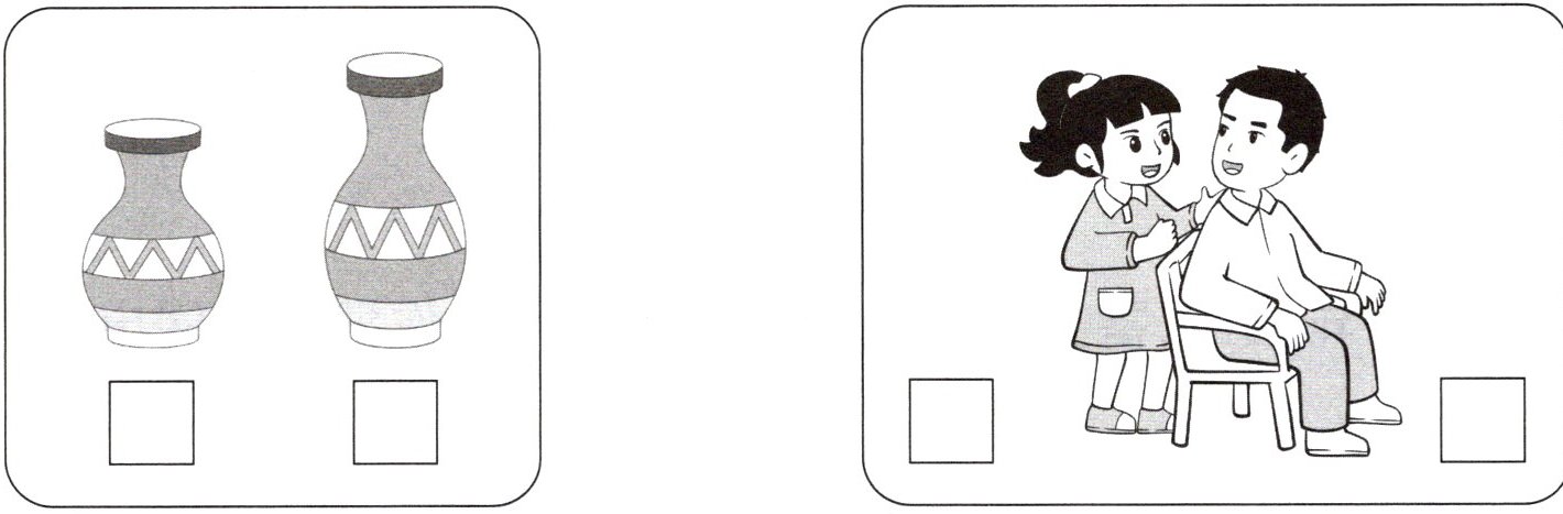 在左侧花瓶下方的方框内画“×”,在右侧花瓶下方的方框内画“√”。