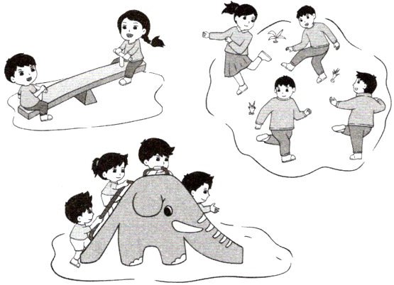 3. 踢毽子的有4人,玩跷跷板的有2人,玩滑梯的有4人。一共有多少人?