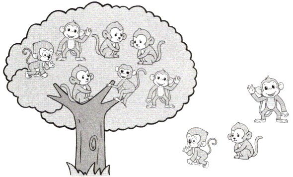 2. 树上有7只猴,又来了3只猴。一共有多少只猴?