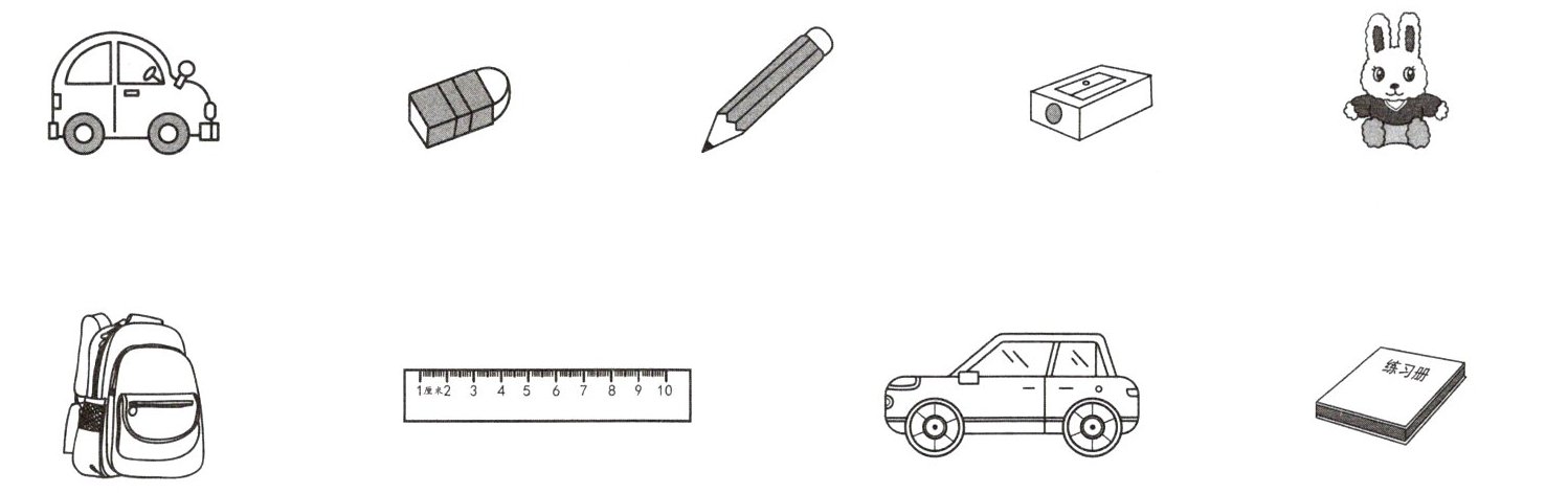 圈出:橡皮、铅笔、卷笔刀、尺子、书包、练习册(将图中的橡皮、铅笔、卷笔刀、直尺、书包、练习册用圆圈圈出)。