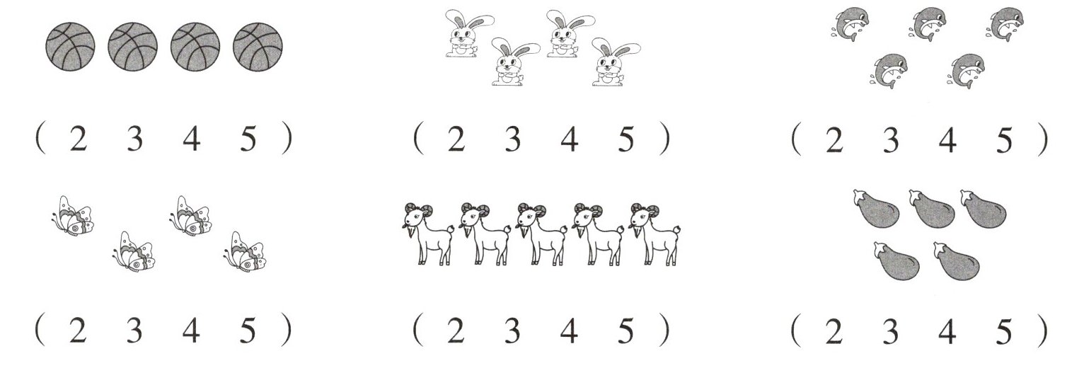 第一幅图数出4个篮球,圈4;第二幅图数出4只兔子,圈4;第三幅图数出5条鱼,圈5;第四幅图数出4只蝴蝶,圈4;第五幅图数出5只羊,圈5;第六幅图数出5个茄子,圈5。