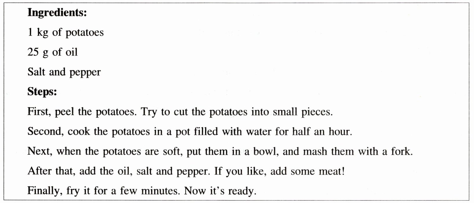 ) 2. What ingredients do we need to make mashed potatoes?①Potatoes ②Oil ③Salt ④Sugar ⑤pepper