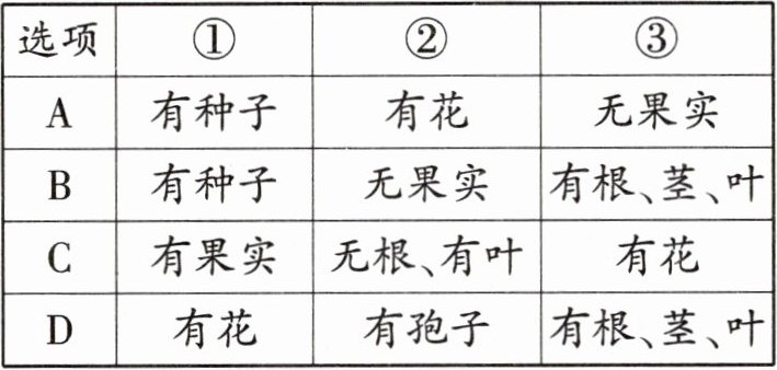 7.A 【解析】被子植物能开花并结出果实和种子,A正确;苔藓植物有假根,只起到固定作用,有类似茎和叶的分化,B错误;雪松、马尾松属于裸子植物,种子外无果皮包被,C错误;贯众属于蕨类植物,能够产生孢子,D错误。