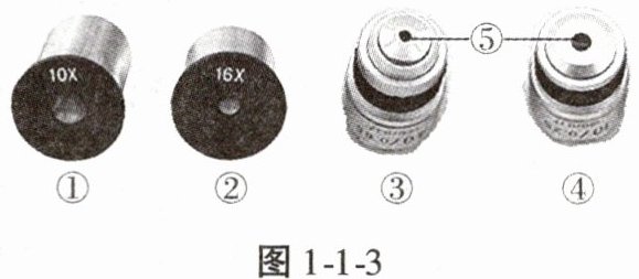 2. (2024·陕西中考)显微镜配置的物镜放大倍数为$10×$、$40×$。如图1-1-3所示,①②是目镜,③④是物镜,物镜镜头上⑤的直径越大,通过光线越多,视野越亮。显微镜放大倍数越大,观察到的视野越暗。视野中,细胞数量最多的组合是(