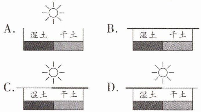9. 【教材P12题2变式】某生物学兴趣小组的同学做了“验证蚯蚓具有疏松土壤的作用”实验后,发现土壤湿度、光照等会对蚯蚓的生活产生影响。若要探究“土壤湿度对蚯蚓的影响”,应选择下列哪一实验装置(