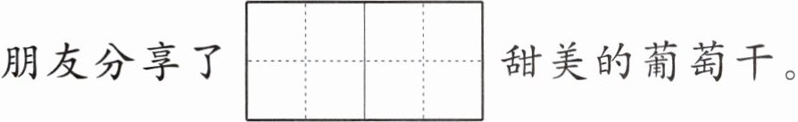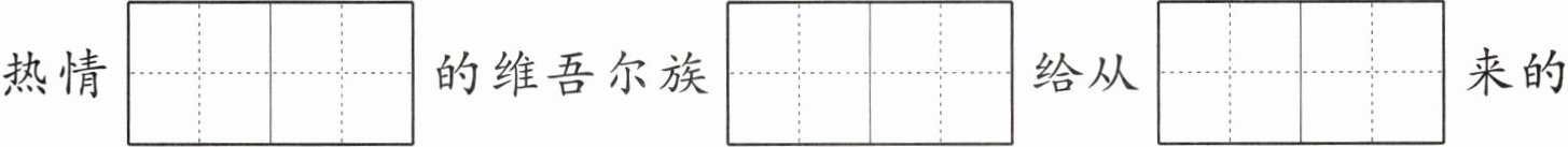热情$\begin{array}{|c|c|}\hline hào & kè \\ \hline & \\ \hline \end{array}\\ \hline & \\ \hline 的维吾尔族\begin{array}{|c|c|}\hline lǎo & xiāng \\ \hline & \\ \hline \end{array}\\ \hline & \\ \hline 给从\begin{array}{|c|c|}\hline chéng & shì \\ \hline & \\ \hline \end{array}\\ \hline & \\ \hline 来的朋友分享了\begin{array}{|c|c|}\hline wèi & dào \\ \hline & \\ \hline \end{array}\\ \hline & \\ \hline $甜美的葡萄干。