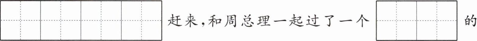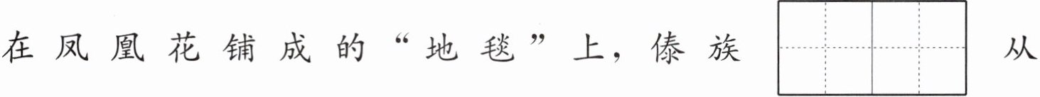周总理______对襟白褂、咖啡色长裤,头上______一条水红色头巾,笑容满面地______人群中。他______一面象脚鼓,______欢乐的鼓点。