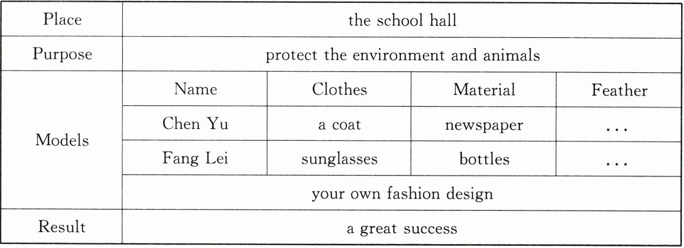 我们学校正在举行一场特殊 (special) 的时装表演,请根据下表信息,以“A Special Fashion show”为题给学校校报写一篇70字的短文,介绍这场时装表演。