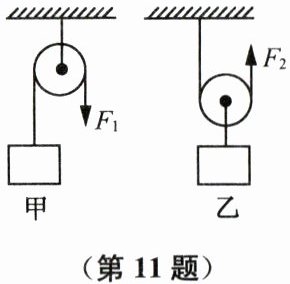 11. 如图所示,用甲、乙两种装置将物体匀速提升相同高度,物体重均为$10\space N$,滑轮重均为$1\space N$,不计绳重和摩擦,所用的拉力分别是$F_{1}$和$F_{2}$,机械效率分别是$\eta_{1}$和$\eta_{2}$,则$F_{1}$