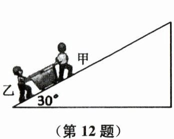 12. 如图所示,甲用$90\space N$的沿斜面方向拉力,乙用$50\space N$的沿斜面方向推力,在$30\space s$内共同使一辆小车从一个倾角为$30^{\circ}$,长为$60\space m$的斜坡底端匀速运动到顶端.甲乙二人对小车共做功