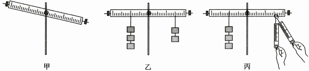 (4) 如图丙所示,小明做完弹簧测力计沿竖直方向拉的实验后,又将弹簧测力计倾斜拉,测出拉力和其对应的力臂,这样做的目的有