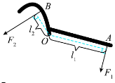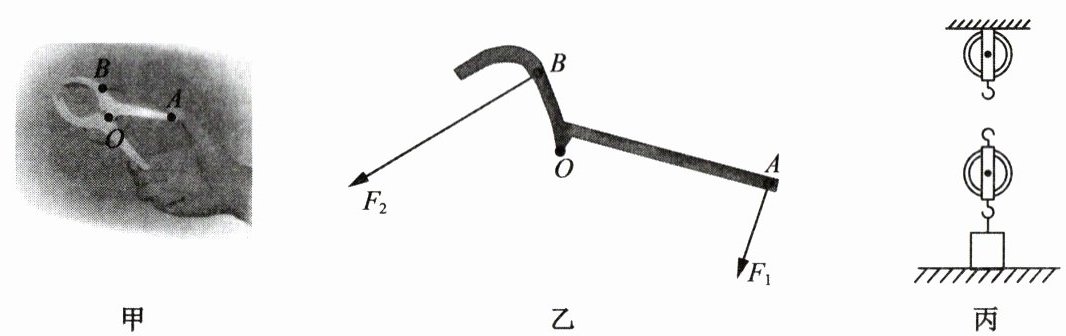 16. (1) 如图甲是晾衣服用的夹子,其中$AOB$可以看成是一个杠杆,其简化示意图如图乙所示,$O$点是支点,$A$点是动力的作用点,$B$点是阻力的作用点.请在图乙中画出捏夹子时,动力$F_{1}$的动力臂$l_{1}$,以及阻力$F_{2}$的阻力臂$l_{2}$.