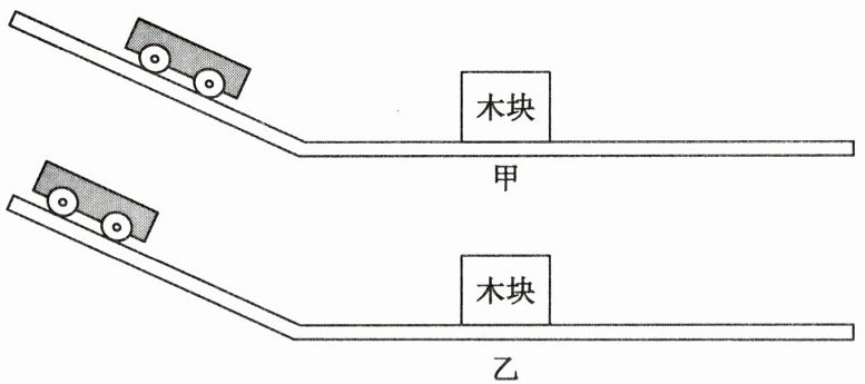 18. 在探究动能大小与哪些因素有关的实验中,小明做了如图甲、乙所示的对比实验,让同一辆小车从同一斜面不同高度处由静止开始下滑,撞击置于水平面上的木块.