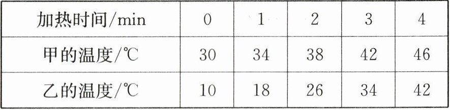 (2) 实验记录数据如上表格所示,从开始加热到末温为$42^{\circ}C$时,甲、乙两种液体吸收热量的关系为$Q_{甲}$