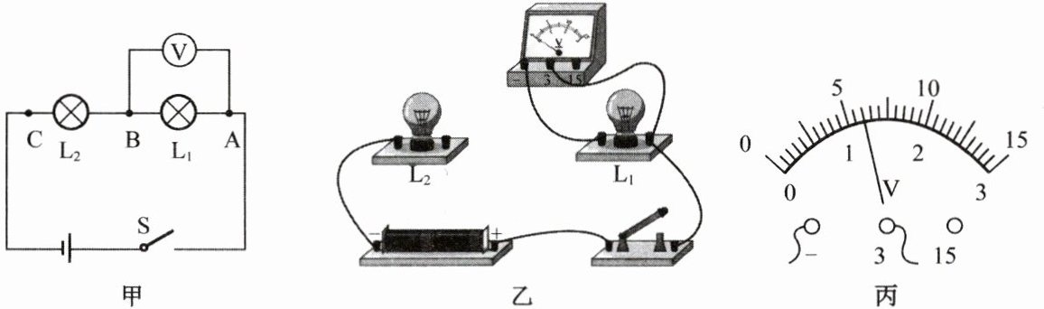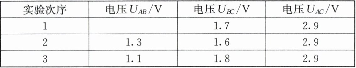 (3) 用电压表分别测出电压$U_{AB}、$$U_{BC}$和$U_{AC}. $其中测$U_{AB}$时,电压表的示数如图丙所示,示数为