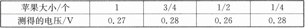 (2) 小明又提出猜想四:水果电池的电压与水果大小有关.他将苹果依次切去一部分来做实验,保证其他条件相同,并将数据记录如下: