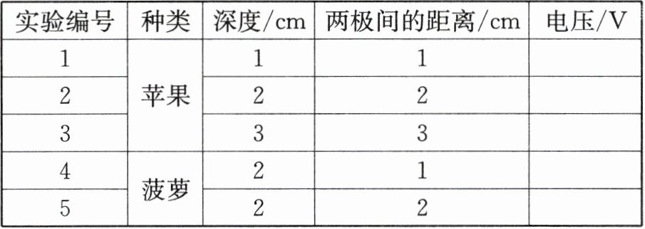 | 实验编号 | 种类 | 深度/cm | 两极间的距离/cm | 电压/V |