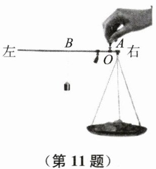 11. 杆秤在我国有几千年的历史,如今中药房仍在使用。如图所示,已测得刺五加药材质量是120g,其中$OB = 3OA$,若不计杆秤自重,则秤砣的质量约为