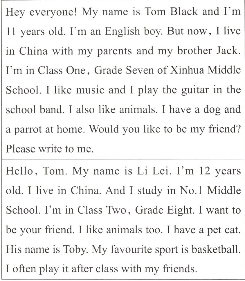 1.A 由框一中“I’m an English boy.”可知,Tom是英国人,故选A。 2.B 由框一中“I also like animals.I have a dog and a parrot at home.”可知,答案为B。 3.B 由框二中“I’m in Class Two,Grade Eight.”可知,答案为B。 4.C 由框一中“I also like animals.”与框二中“I like animals too.”可知,Tom和Li Lei都喜欢动物。C项正确。
