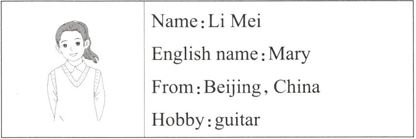 One possible version: Hello, boys and girls! Nice to meet you! I’m Li Mei. My family name is Li, and my first name is Mei. My English name is Mary. I am 14 years old. I am from Beijing, China. I like music very much. I can play the guitar very well. Do you want to be my friend?