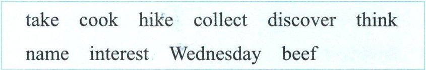 1.to cook 2.taking 3.hiking 4.discover 5.Beef 6.interested 7.collecting/to collect 8.Wednesdays 9.think 10.names