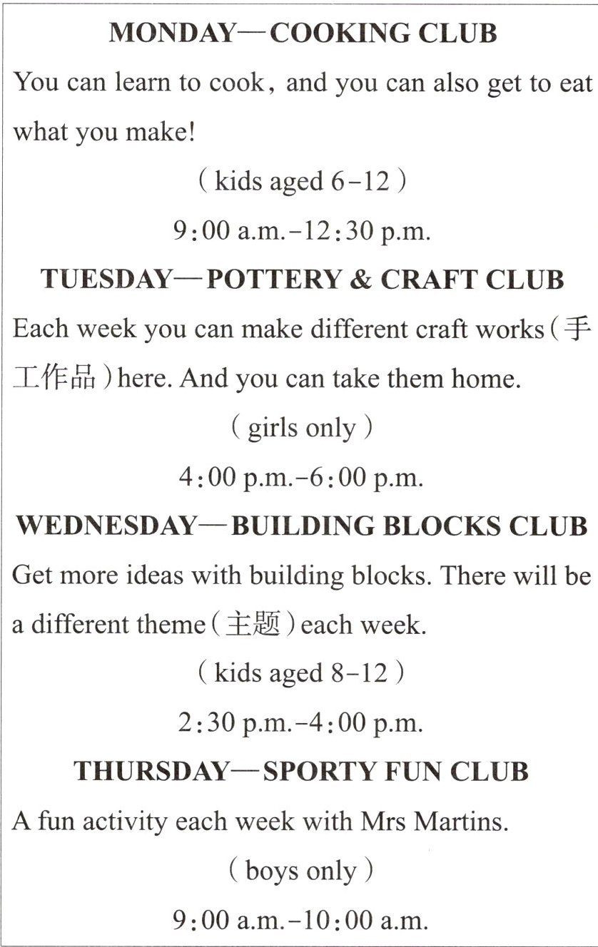 1.A 根据短文第一句中的after school和每个社团针对的人群kids,boys,girls可知,短文的目标受众是学生。故选A。 2.C 根据MONDAY—COOKING CLUB对应的9:00 a.m.-12:30 p.m.可知,每次学习烹饪时长是3.5小时。故选C。 3.B 根据五个社团的年龄和性别要求可知,5岁的小女孩可以参加周二的Pottery & Craft Club。故选B。 4.B 根据FRIDAY—GARDENING对应的“Learn how to keep your garden with Mrs Lowe.”可知,B项表述“Lowe老师会教你如何打理花园”符合文意。故选B。 5.C 本文是几个社团的广告,最有可能出现在学校的布告板上。故选C。