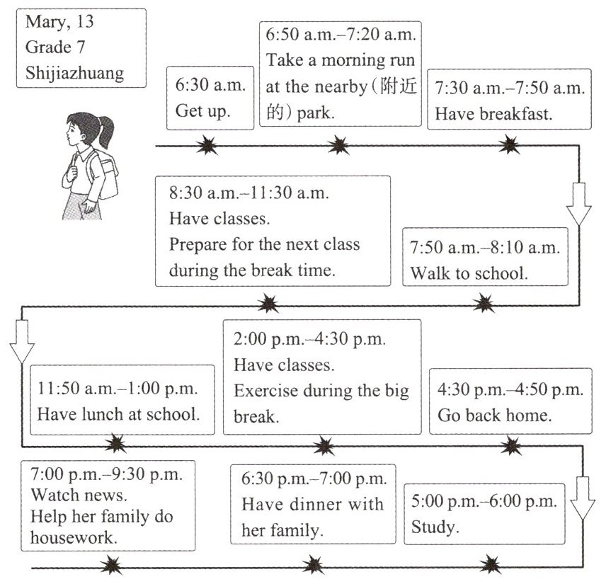 Ⅰ .1.C 由“6:30 a.m. Get up.”后的“6:50 a.m.-7:20 a.m.