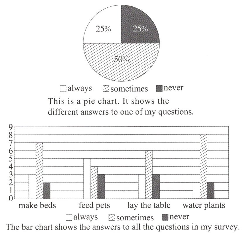 I wanted to find out how the children in my class help at home so I did a class survey (调查). First, I chose four typical chores. Then I asked 5 boys and 7 girls the questions and got their answers. I showed the results in two different ways: first, in a pie chart (饼状图) and then on a bar chart (柱状图).