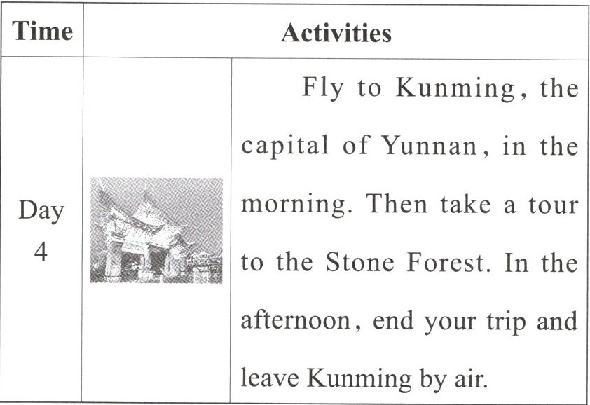 4.C 根据Day 3行程中的“Do some shopping in the old Dali town.”可知,第三天可以参观大理古城。故选C。