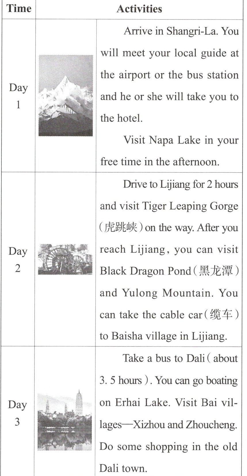 3.B 根据Day 3的行程安排“You can go boating on Erhai Lake.”可知,B项“洱海”是在大理,不是在丽江。故选B。