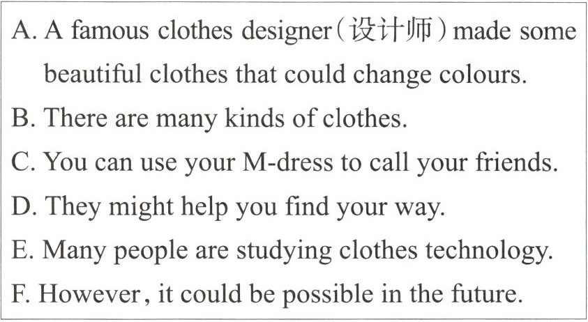 Your clothes might even change shapes according to your size. ____4____ They might also tell you whether you are fit or not. They could tell you where someone is asking you to meet him or her, or tell you what’s on at a movie theatre. You might even want your clothes to play music. It may seem impossible today. ____5____ Let’s look forward to these great changes in the future!