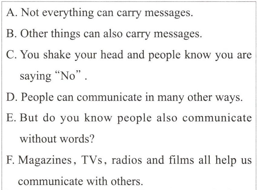 When you speak, write a letter, or make a telephone call, your words carry a message. People communicate with words. ____1____ A smile on your face shows you are happy or friendly. Tears in your eyes tell others that you are sad. When you put up your hand in class, the teacher knows you want to say something or ask questions. ____2____ You nod and people know you are saying “Yes”.