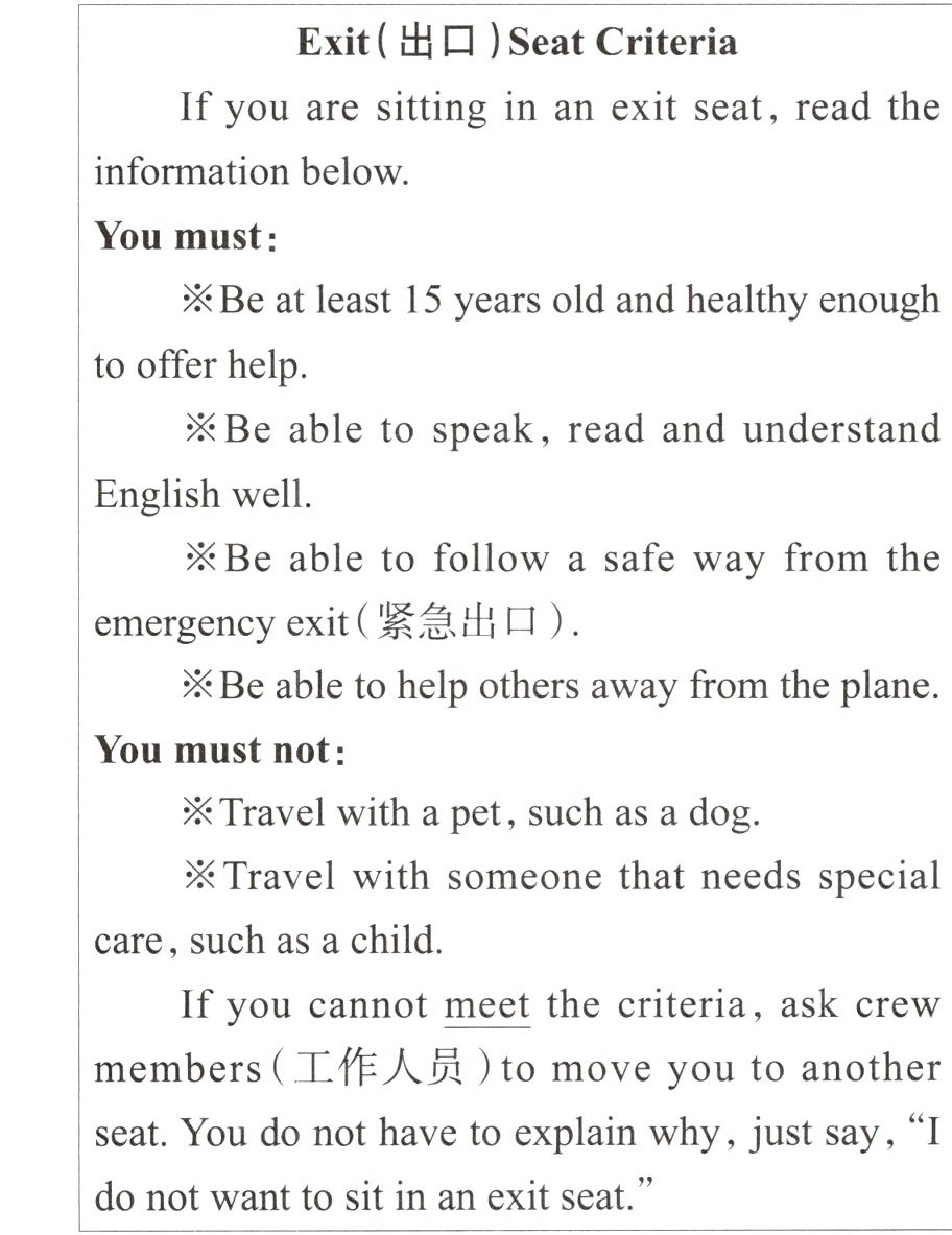 ) 2. If you are sitting in an exit seat, you CANNOT ____.A. explain the reason
