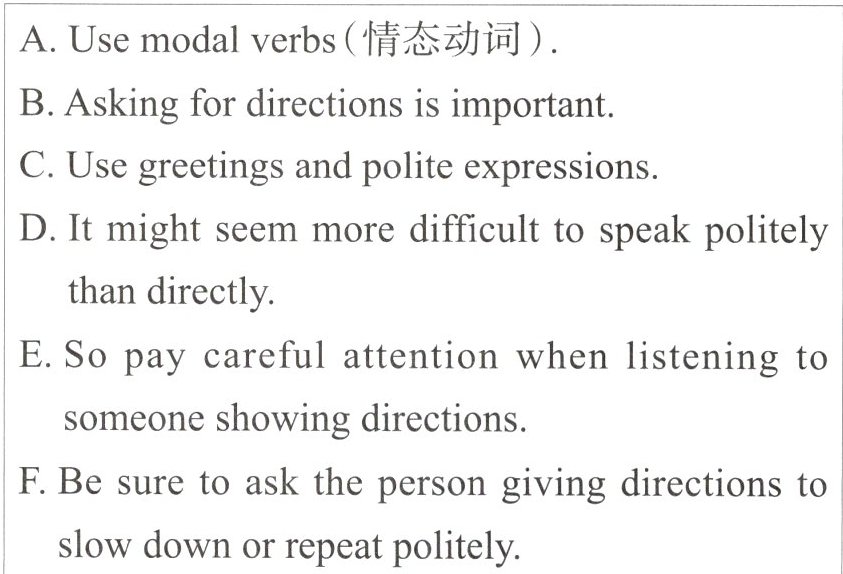 ____ 1 ____ However, people become confused (困惑的) easily when listening to someone giving directions. ____ 2 ____ For example, he or she may tell you, “Go down the street and turn right at the first crossing. Walk two miles, and then you will find a movie theater and China Bank is across from the theater.” After listening to someone providing directions in English, are you clear? Here is some advice to help you remember the directions.