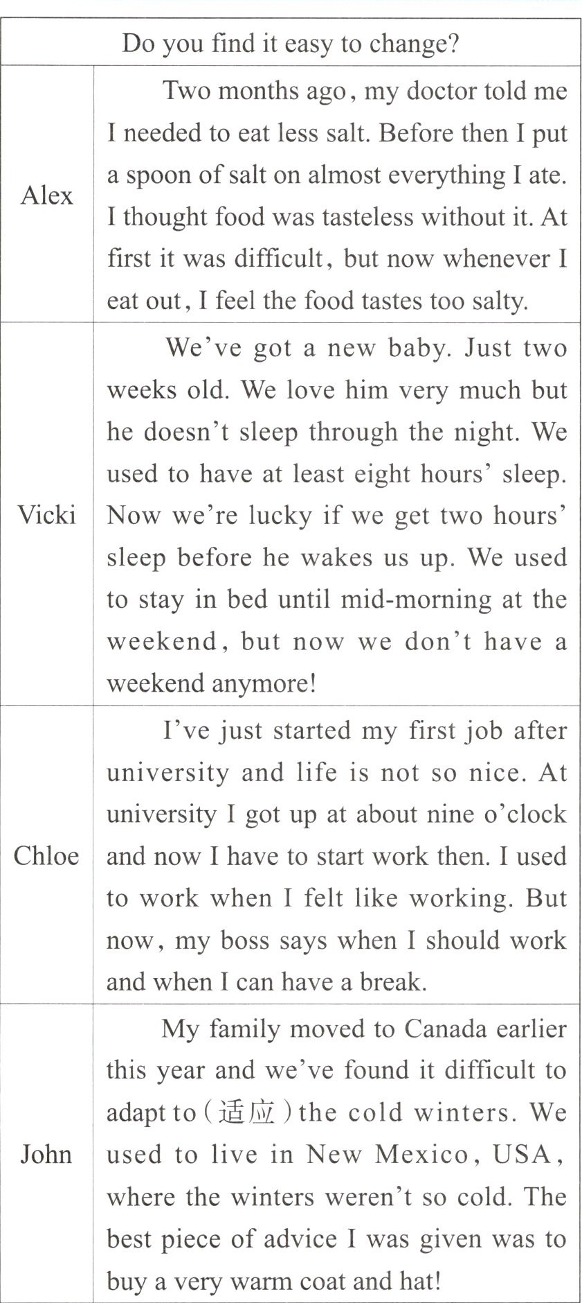 )4. Who welcomes (欣然接受) the change in his/her life?A. John.