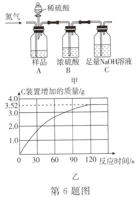 6. 为了测定某品牌食用纯碱中碳酸钠的质量分数,小明取 $10\mathrm{g}$ 食用纯碱样品和足量的溶质质量分数为 $10\%$ 的稀硫酸,进行如图甲实验,实验前后,均需往装置中缓慢通一会儿氮气(样品中其他成分不与稀硫酸反应)。