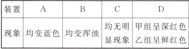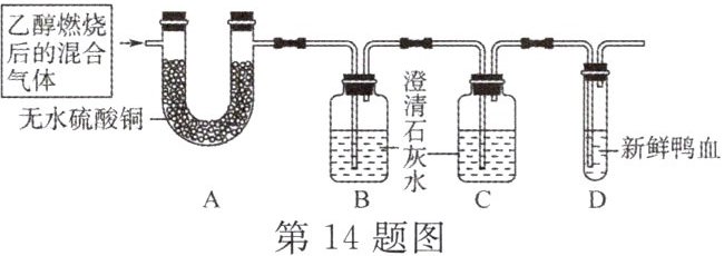 14. 乙醇$(C_2H_5OH)$俗称酒精,具有可燃性。甲、乙两小组同学为了确定乙醇在氧气中燃烧的产物,先将乙醇在氧气中点燃,再用燃烧后的混合气体进行如图所示实验。(无水硫酸铜遇水变成蓝色;新鲜鸭血遇 $ O_2 $ 呈深红色,遇 $ CO_2 $ 呈暗红色,遇 CO 呈鲜红色)。甲、乙两小组实验观察到的现象如表所示:
