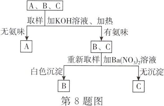 8. 为鉴别硫酸铵、硝酸铵、硝酸钠三种无色溶液,将它们随机编号为 $A$、$B$、$C$,实验过程及现象如图所示: