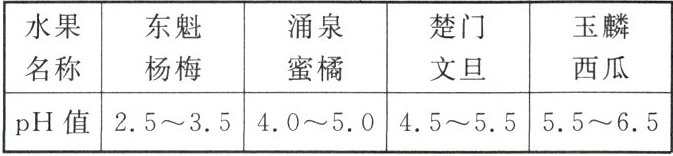 5. 台州气候适宜,盛产各种酸甜爽口的水果,深受市民喜爱。分析表格,判断其中酸性最强的水果是(