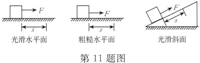 11. 同一物体在相同大小的力F作用下,沿力F的方向移动了相同的距离s,试比较在图示的三种情况中,力F对物体做功的大小($W_{1}$、$W_{2}$、$W_{3}$分别表示力F在光滑水平面、粗糙水平面、光滑斜面对物体做的功)(